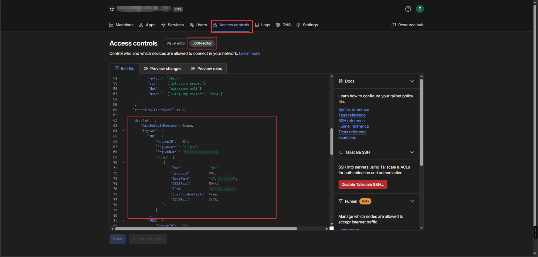 在 Tailscale 后台配置中,添加自建 DERP 服务器的信息。具体配置方法如下: